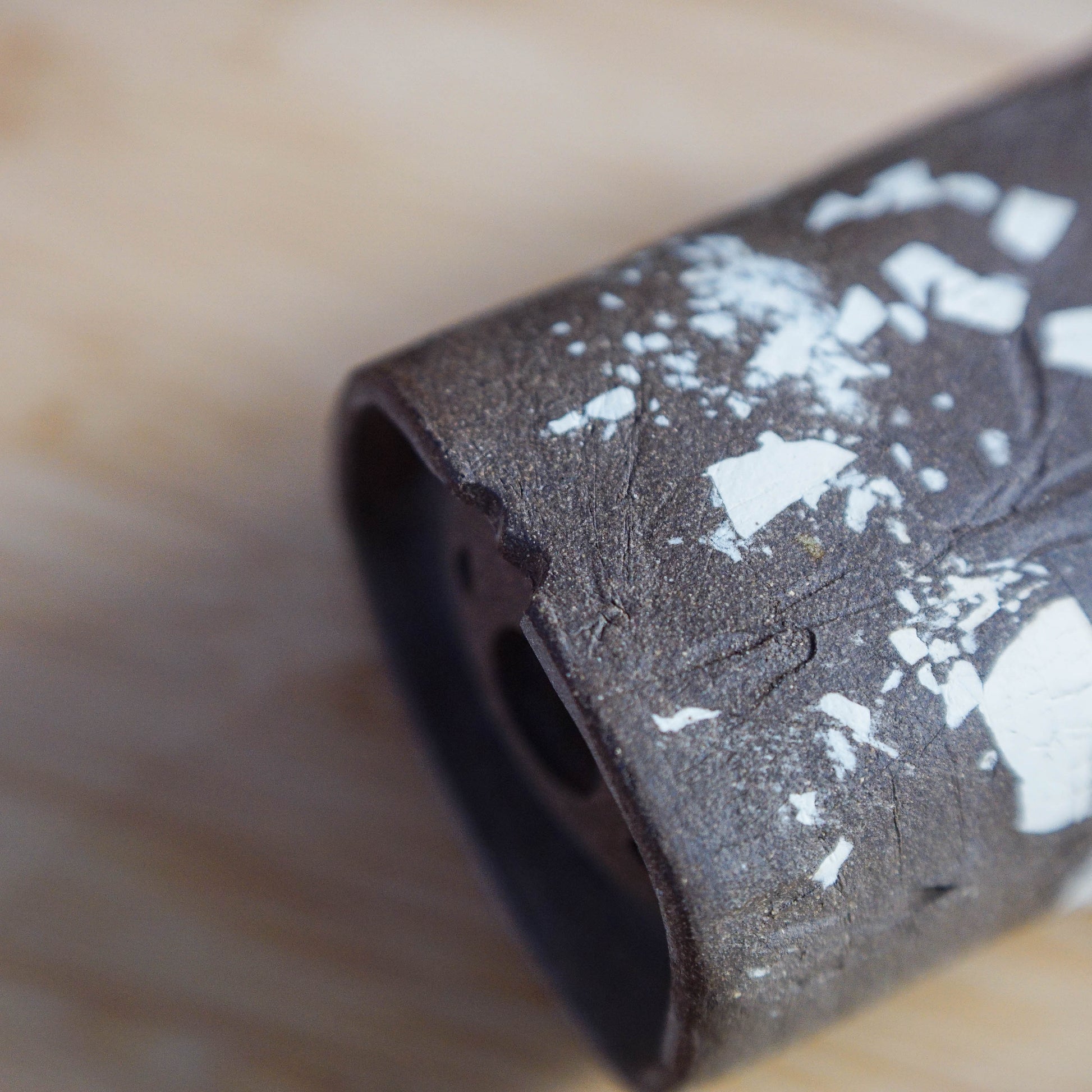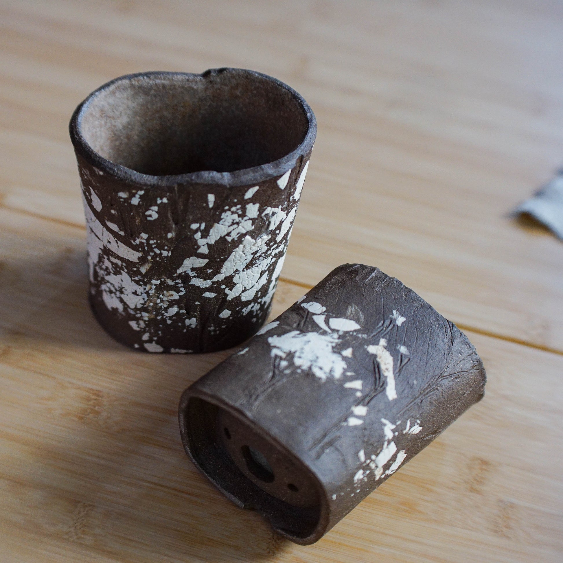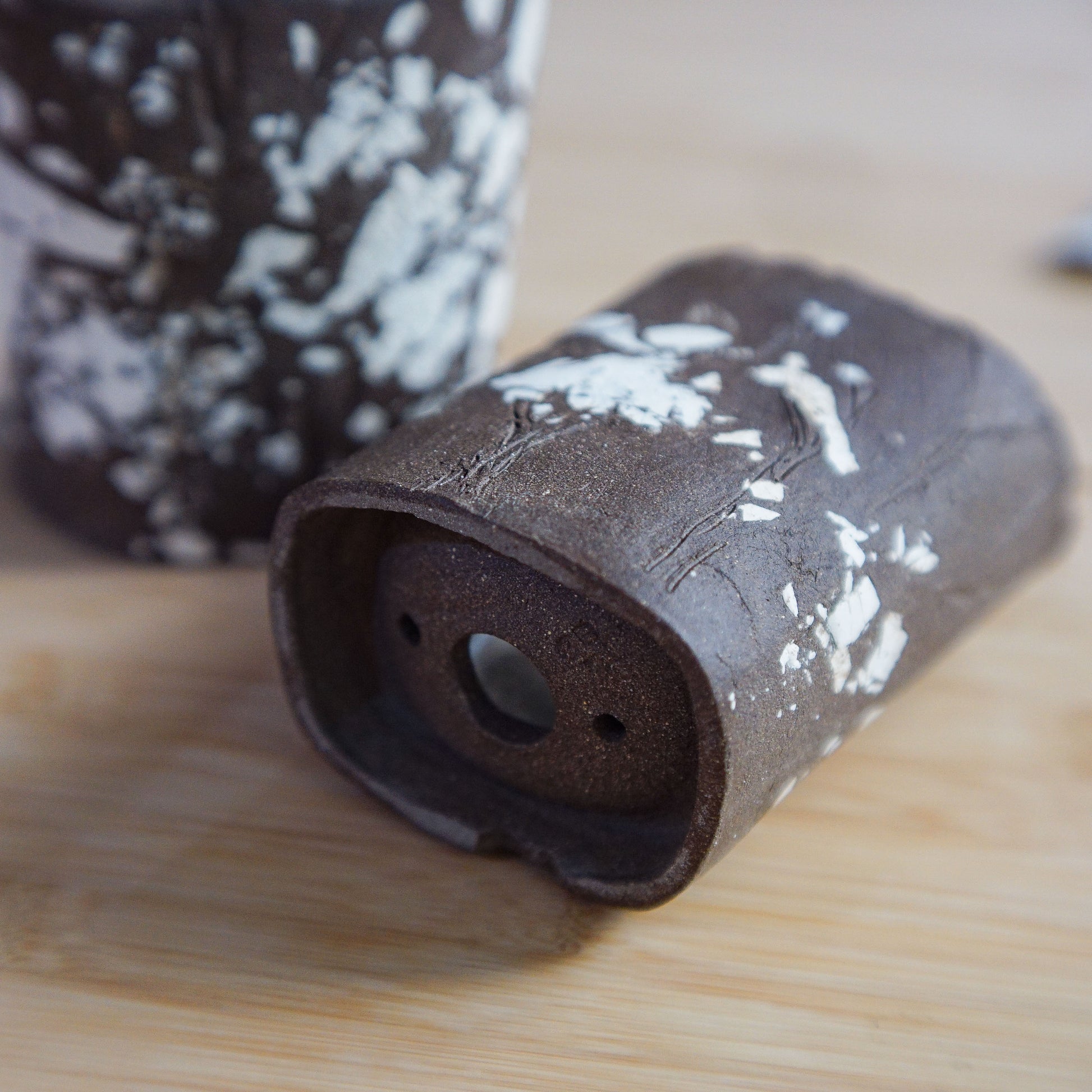 用手捏發泥板混合的方式成形,在啡色土中加入白色的泥土,啡土隨捲曲形成如樹幹的裂紋,白土就像地衣,器物下方透氣和出水的切口也是山的雕刻,有山有樹的自然,再配上植物特別別致。