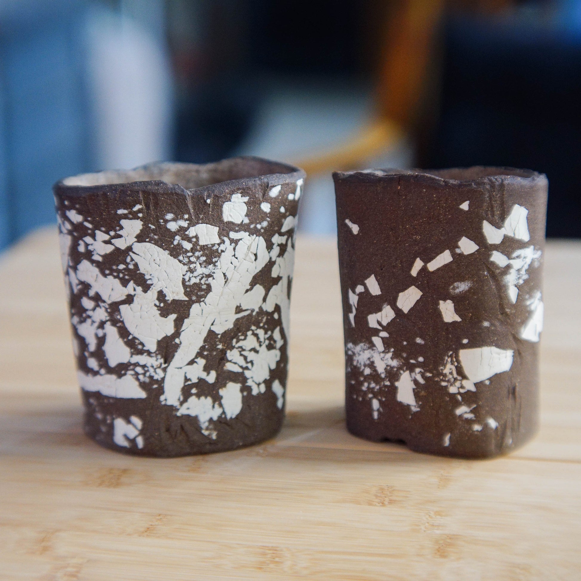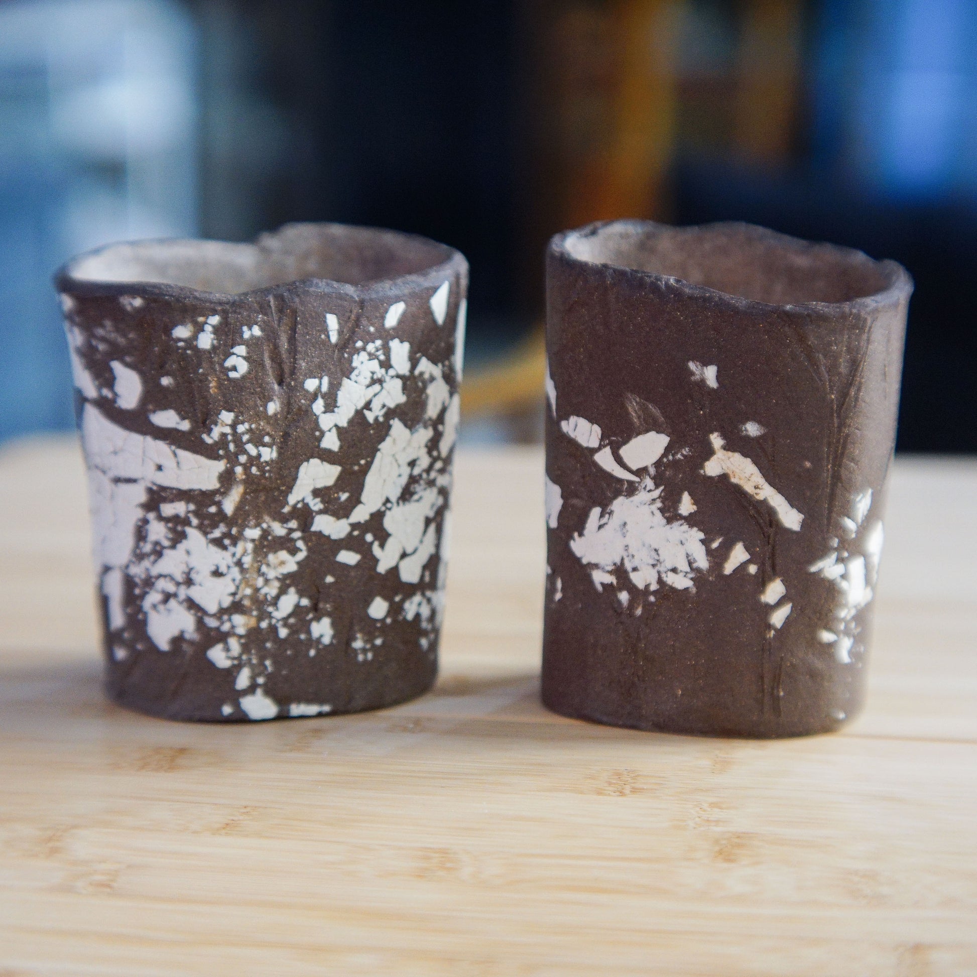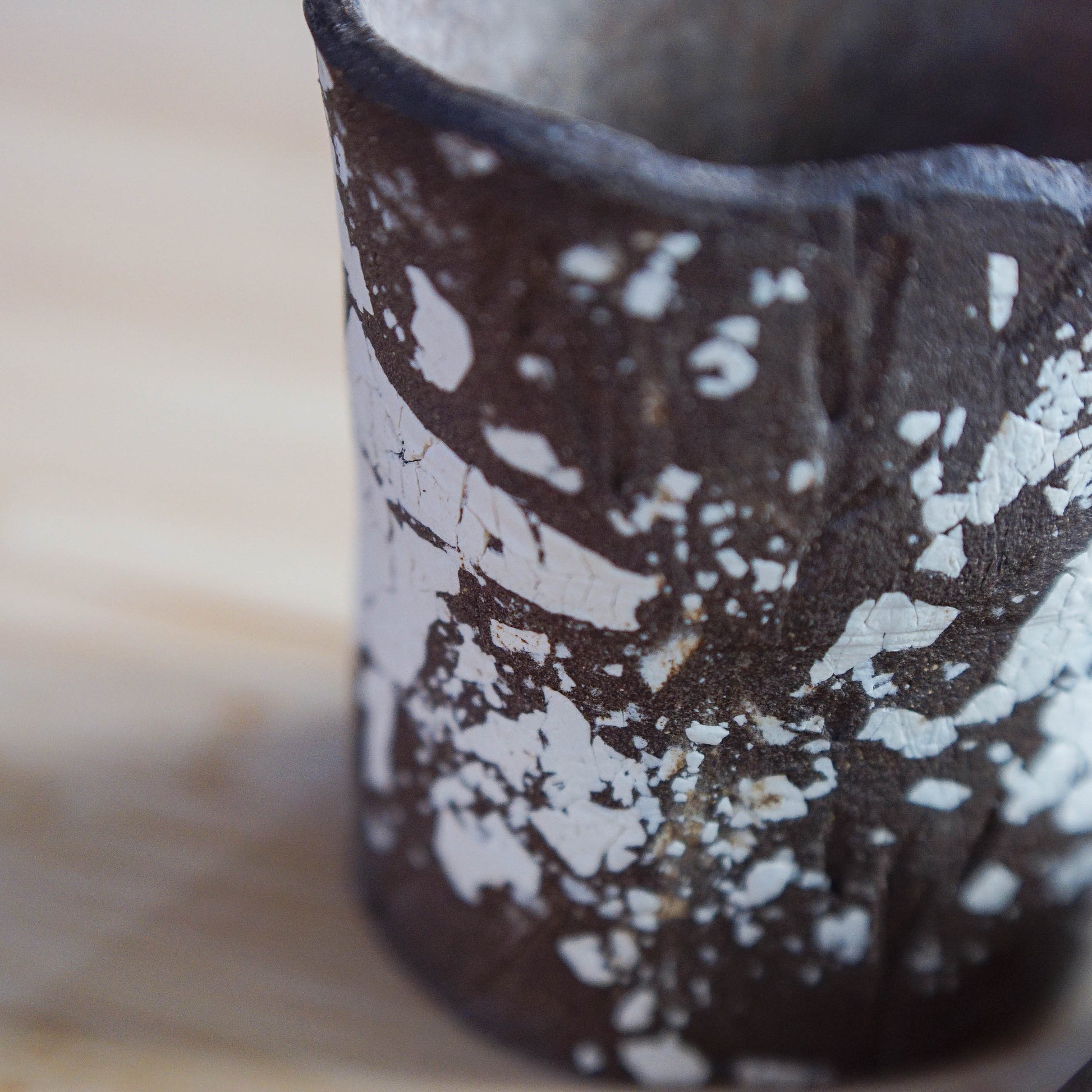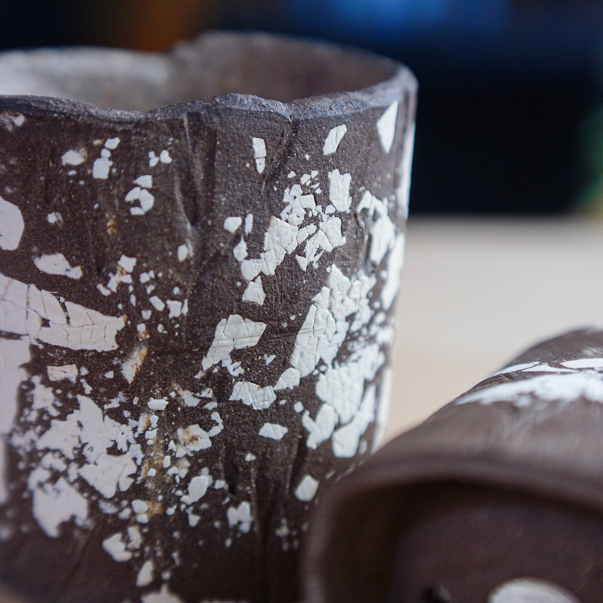 用手捏發泥板混合的方式成形,在啡色土中加入白色的泥土,啡土隨捲曲形成如樹幹的裂紋,白土就像地衣,器物下方透氣和出水的切口也是山的雕刻,有山有樹的自然,再配上植物特別別致。
