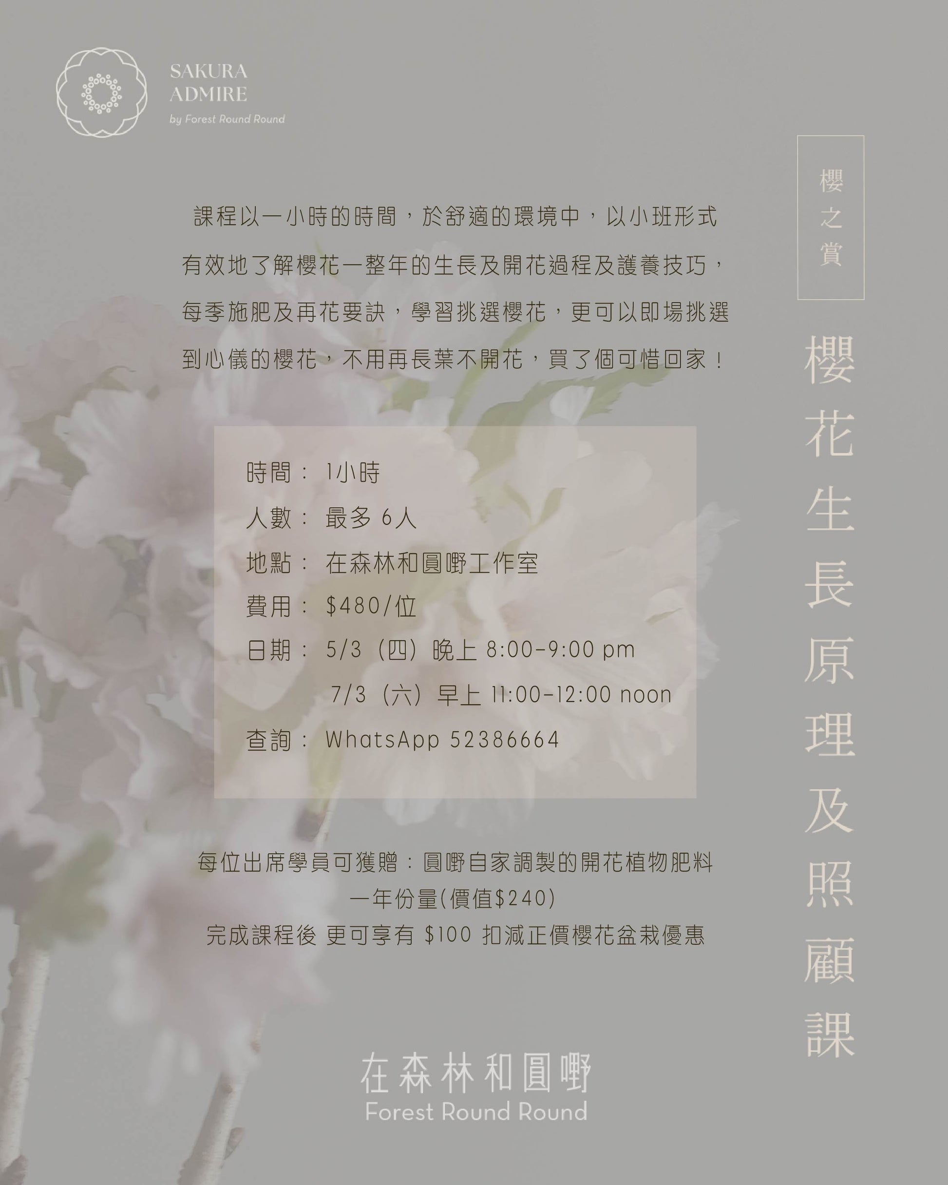 課程以一小時的時間,於舒適的環境中,以小班形式有效地了解櫻花整整一年的生長及開花過程及護養技巧,每季施肥及再花要訣,學習挑選櫻花,更可以即場挑選到心儀的櫻花,不用再長葉不開花,買了個可惜回家!